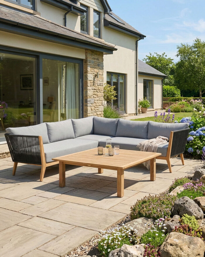 Luxusná terasa: teakové zostavy, veľké sedacie súpravy, robustné stoly