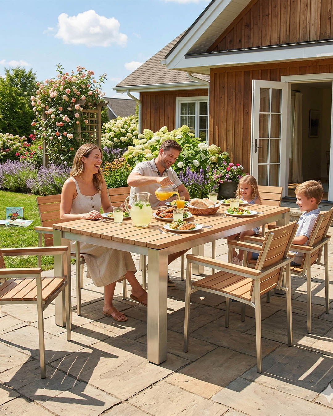 Kombinácia nerezovej ocele a teaku spája pevnosť kovovej konštrukcie s prirodzeným vzhľadom dreva. Nerezová oceľ zabezpečuje stabilitu a vysokú odolnosť voči korózii, zatiaľ čo teak prináša teplý prírodný vzhľad a dlhú životnosť.