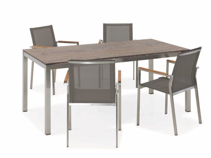 Jedálenský stôl na terasu z HPL dosky je spojením modernej technológie a praktického dizajnu. Umožňuje vytvoriť si stôl presne podľa vlastných predstáv – s výberom konštrukcie z nerezu alebo hliníka, piatimi dekorovými variantmi dosky a štyrmi veľkosťami.