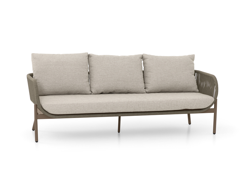 Konštrukcia sedačky je vyrobená z bezúdržbového hliníka vo farbe Mokka / Šedo-biela, na ktorú je ručne napletané odolné lano (Rope). Lanový výplet je pružný, vzdušný a rýchlo schne, čo z neho robí ideálny materiál do exteriéru. Pohovka poskytuje veľkorysý priestor pre tri osoby a je dodávaná s mäkkým polstrovaním.