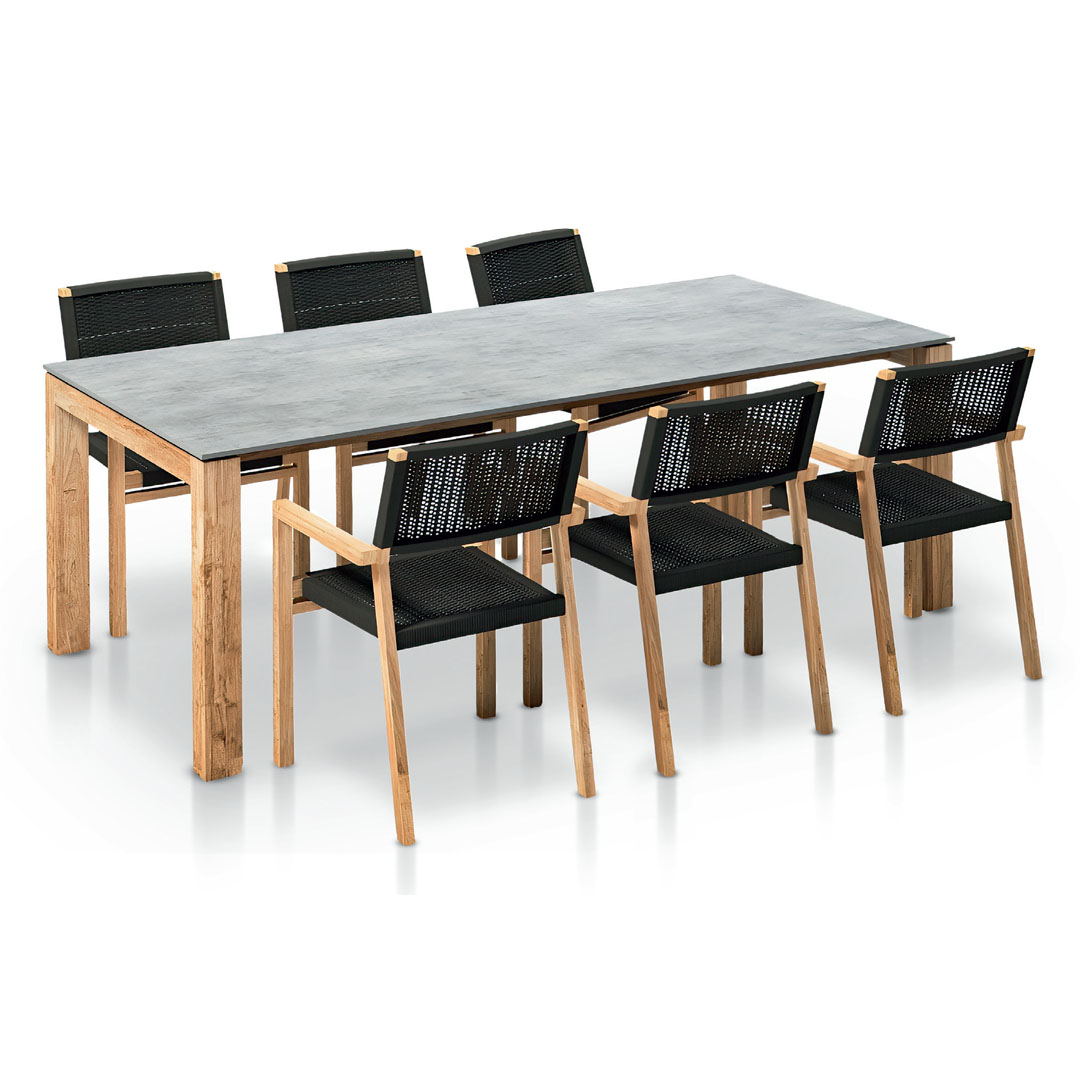 Set Denver kombinuje stôl z recyklovaného teaku s masívnou keramickou doskou, ktorá je prakticky nezničiteľná.