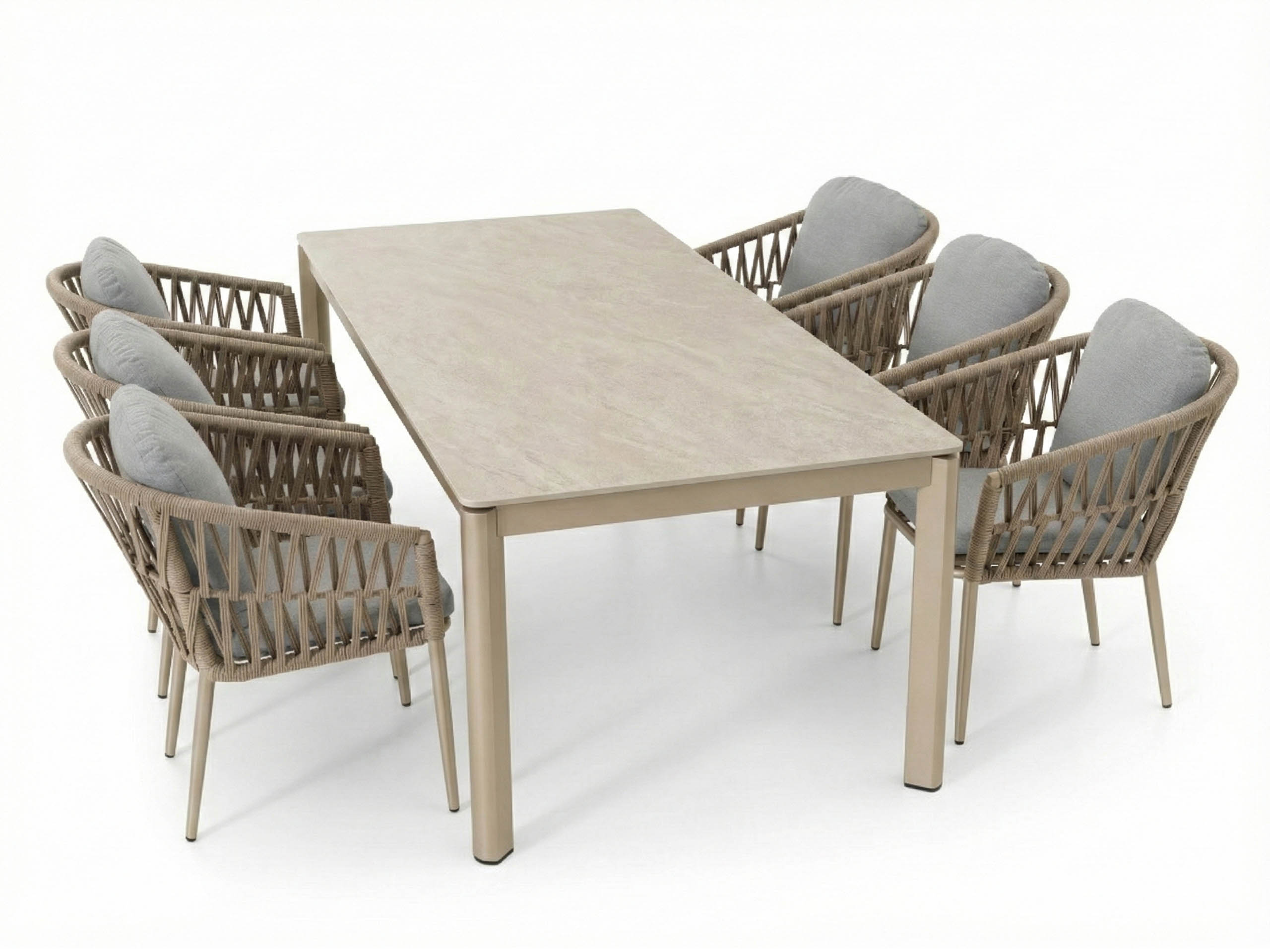 Prémiový set Lyon XL vo farbe Champagner ponúka veľký stôl s keramickou doskou (220 x 100 cm) a 6 ergonomických stoličiek. Vďaka svetlej farbe pôsobí set vzdušne a nepáli na slnku.
